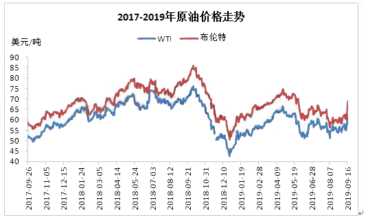 ????????9月14日,沙特關(guān)鍵原油設(shè)施遭受無人機(jī)攻擊,導(dǎo)致其關(guān)閉一半原油產(chǎn)量,影響全球約5%的日均產(chǎn)量。9月16日,原油受此提振大幅上漲,美布兩油均創(chuàng)下近十年內(nèi)最大漲幅,紐約商品期貨交易所WTI 10月原油期貨合約收盤上漲8.05美元,至62.90美元/桶,漲幅14.68%,洲際交易所布倫特11月原油期貨合約收盤上漲8.80美元,至69.02美元/桶,漲幅14.61%。