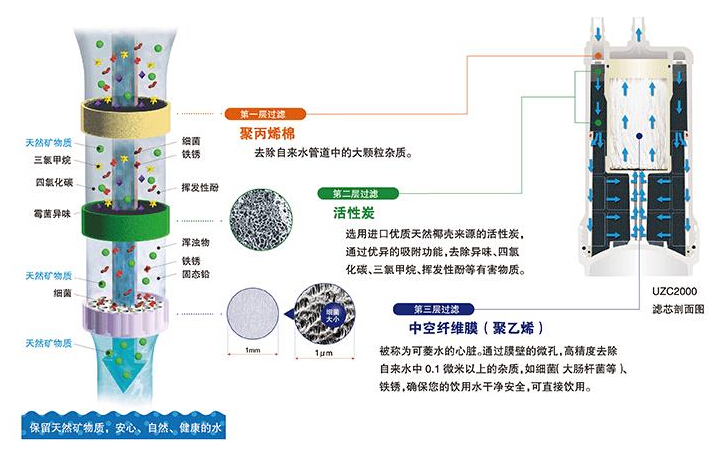 ????????通過聚丙烯棉、活性炭及中空纖維膜組成的三層過濾系統(tǒng),過濾后保留天然礦物質(zhì),為用家?guī)戆残摹⒆匀弧⒔】档娘嬘盟?/p>