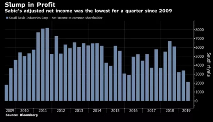 ????????由于對化學品和塑料的需求下降,沙特基礎工業(yè)公司(Saudi Basic Industries Corp.)第二季度利潤跌至2009年以來的最低水平,其股價下跌3.8%。
