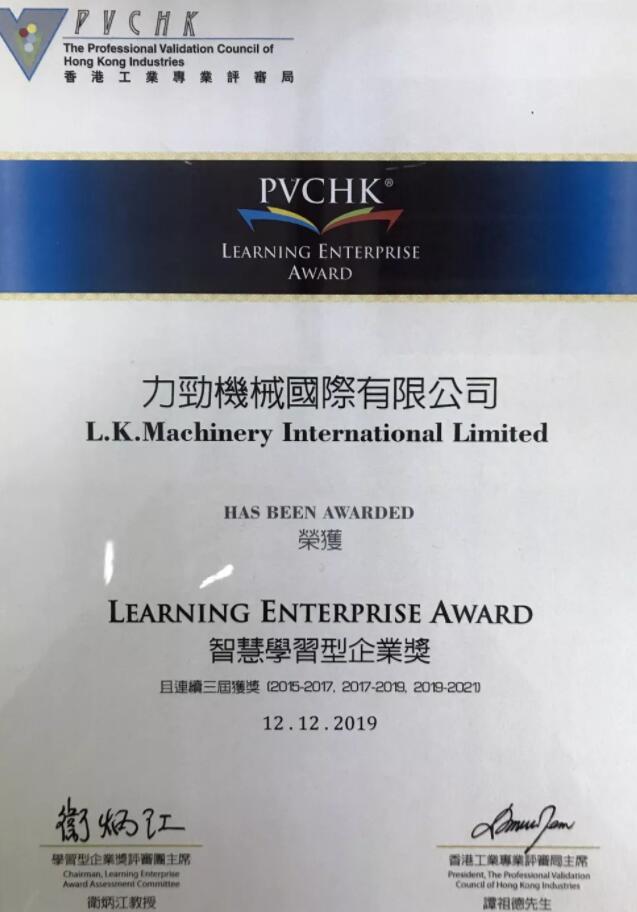 經過自我評估、評審專員初評和獨立終審委員會專家的最終客觀審定,力勁集團在“資源投入推動人才培訓”、“系統化管理人才發展”、“資訊科技應用”、“策略運用”、“企業文化”五個標準、五十項細節方面達到評審標準,榮獲“2019智慧學習型企業獎”。力勁集團CEO劉卓銘先生、董事會主席張俏英女士出席頒獎典禮。