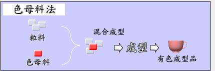 這種方法主要在注塑成型時(shí),把顏色溶度高的有色母料混合到著色材料中,主要用于黑灰色產(chǎn)品著色。