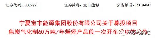 ????????公告顯示,焦炭氣化制60萬噸/年烯烴項目是寶豐能源首發上市募集資金投資項目,項目總投資金額達152.79億元。該項目主要分為兩段:前段焦炭氣化制220萬噸/年甲醇項目,后段甲醇制60萬噸/年聚烯烴項目,以及相關配套公用工程,預計將于2019年底前全部建成投產。