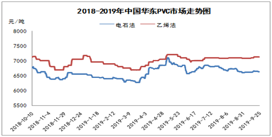 ????????第四季度是PVC傳統意義上的消費淡季,整體交易活躍度與交易價格均呈現緩慢下滑或回落的態勢。以華東SG-5為例,去年同期價格自6800元/噸以上的水平緩慢下滑至6380元/噸,年底受期貨走高影響,市場價格小幅反彈。2019年四季度國內PVC市場仍然面臨著面臨著環保、采暖季限產等問題,預計將延續偏弱震蕩的行情。區域性價差仍不大,上調阻力明顯,微調下行仍相對頻繁。