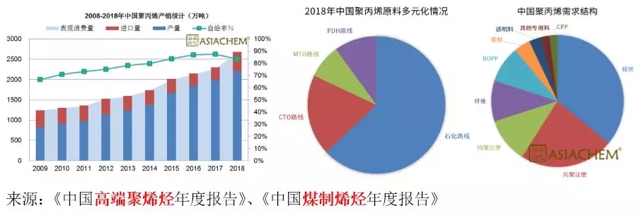 ????????聚丙烯(PP)是需求量最大的通用聚烯烴(PO)產(chǎn)品之一,在全球的消費(fèi)量?jī)H次于聚乙烯(PE)。中國(guó)是PP生產(chǎn)和消費(fèi)大國(guó)。亞化咨詢數(shù)據(jù)顯示,截至2018年底中國(guó)已建成投產(chǎn)PP產(chǎn)能約2400萬(wàn)噸/年,并且形成了石化、煤化工(CTO/MTO/MTP)、丙烷脫氫(PDH)等原料路線多元化發(fā)展的趨勢(shì)。中國(guó)PP需求量呈現(xiàn)穩(wěn)定增長(zhǎng),2018年表觀消費(fèi)量約2600萬(wàn)噸,供需缺口近400萬(wàn)噸。中國(guó)PP主要消費(fèi)領(lǐng)域是拉絲、注塑和纖維等,應(yīng)用于包裝、電子、與家電、汽車、纖維、建筑管材等領(lǐng)域。