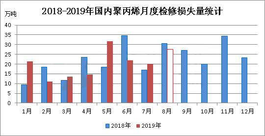????????據統計,2019年7月份國內聚丙烯檢修損失量在20.12萬噸,環比(2019年6月份22.01萬噸)減少1.89萬噸,降幅在8.58%;同比(2018年7月16.96萬噸)增加3.16萬噸,增幅18.63%。2019年1-7月份,累積檢修損失量為134.52萬噸,較去年同期小幅增加,增幅僅在0.85%。