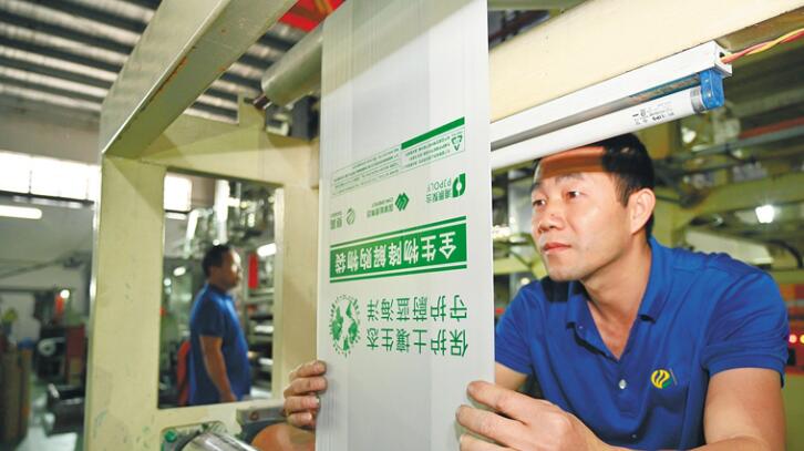 12月9日,位于海口高新區(qū)獅子嶺工業(yè)園的海南賽高新材料有限公司,工人正在生產(chǎn)全生物降解塑料袋。據(jù)悉,該公司是目前海南唯一可生產(chǎn)生物降解材料的企業(yè)。