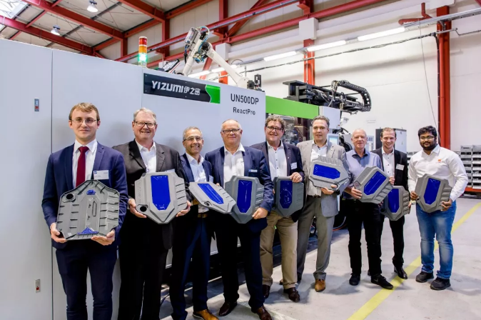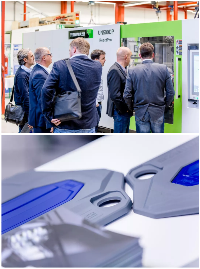 伊之密與合作伙伴Frimo提供的ReactPro方案,將注射成型與聚氨酯(PUR)包覆工藝結合在一起,更簡單、更模塊化、更靈活、更具成本效益。在Frimo總部舉行的聯合技術開放日上,第一套高度集成和自動化的ReactPro系統亮相,現場生產帶聚氨酯表面的發動機蓋,吸引了不少感興趣的專業觀眾。