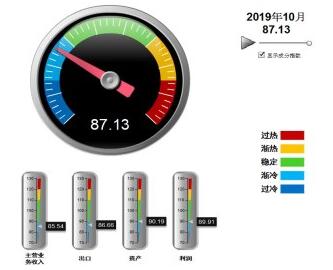 分項景氣指數中,利潤景氣指數環比回升,營收、出口、資產景氣指數環比下降,其中:營業收入景氣指數85.54,位于“漸冷”區間,較9月下降0.01點;出口景氣指數為86.66,位于“漸冷”區間,較9月下降3.59點;資產景氣指數為90.19,位于“穩定”區間,較9月下降0.97點;利潤景氣指數89.91,位于“漸冷”區間,較9月回升0.82點。